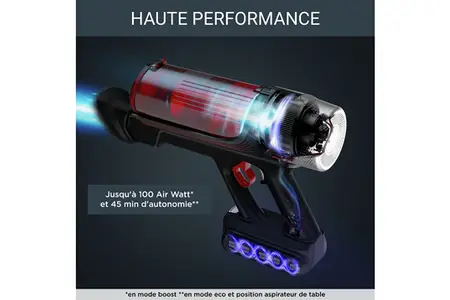 De plus, le moteur pouvant atteindre 100 air-watts de puissance d’aspiration, la batterie puissante de 18 V pour profiter d’une autonomie pouvant aller jusqu’à 45 minutes.