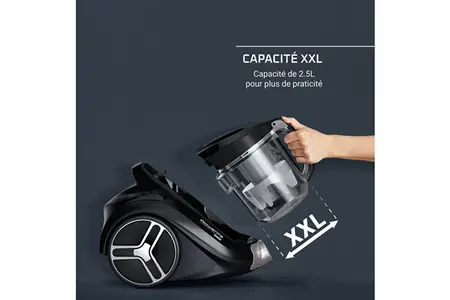 Alliant une performance de nettoyage exceptionnelle et un design ergonomique et moderne, l’aspirateur sans sac COMPACT POWER XXL Modèle Parquet RO4B36EA de Rowenta offre des résultats fiables grâce à sa tête d’aspiration unique à 2 positions power air qui assure une glisse optimale sur toutes les surfaces.Performances:Son moteur haute efficacité lui délivre une puissance d’aspiration maximale de 900W tout en réduisant votre consommation d’énergie.Le flux d’air optimisé et la nouvelle tête d’aspiration unique à 2 positions offrent une efficacité et une performance de nettoyage exceptionnelles.Technologie cyclonique avancée :La puissance de la technologie cyclonique avancée assure une séparation optimale de l’air et de la poussière pour des résultats longue durée.Confort d’utilisation :Profitez d’une performance d’exception dans un silence absolu grâce un niveau sonore particulièrement bas: 69 dB, qui excède à peine celui d’une conversation normale.Hygiène :Le système de filtration à 3 niveaux garantit une séparation optimale de l’air et de la poussière et capture plus de 99,98 % de particules de poussière pour un intérieur plus sain.Liberté de mouvement :Profitez d’un confort d’utilisation maximal grâce à son long cordon de 6,2 m et de son rayon d’action de 8,8 m.Pratique :Sa roue multidirectionnelle et ses 2 grandes roues arrière le rendent parfaitement maniableAccessoires :– Tube Tube télescopique en métal– Brosses 2 positions– Brosse parquet– Suceur 2 en 1– Suceur ameublement plat