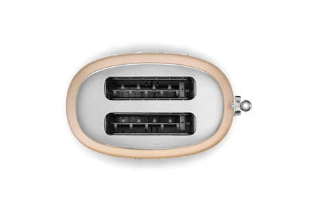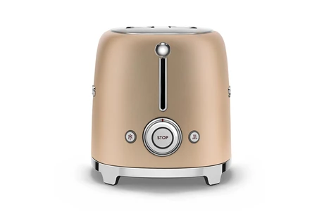 Le grille-pain Smeg TSF01CHMEU vous séduira par son esthétique rétro années 50, son coloris OR MAT mais aussi par son format compact !Équipé de 2 fentes, 6 niveaux de brunissage, 3 fonctions tout est réuni pour vous offrir les meilleures performances.Design et robuste :Avec sa conception du corps en inox offre robustesse et durabilité et son coloris or mat lui permet de s’intégrer dans tous les types de cuisines, des plus classiques aux plus modernes.Performances :Toast grillé, juste doré, tiède… ce grille pain est doté d’une puissance de 950 watts vous propose un thermostat réglable 6 niveaux pour adapter le brunissage selon vos besoin.Fonctions :Le grille-pain équipé de deux fentes possède :– Une fonction décongélation : si vous avez du pain congelé, n’hésitez pas ! Sortez-le, placez-le dans les fentes et dégustez-le !– La fonction réchauffage est idéale pour savourer un pain toujours à la bonne température.– La fonction Bagel vous permet de griller seulement une seule face de vos bagels et muffins.Praticité :Son tiroir ramasse-miettes amovible vous facilitera le quotidien ! En effet, plus besoin de déplacer le grille-pain pour le vider, une simple pression suffira à extraire le tiroir.Pour un rangement aisé, le range-cordon est intégré au grille-pain.Pour plus de stabilité les pieds sont anti-dérapants.
